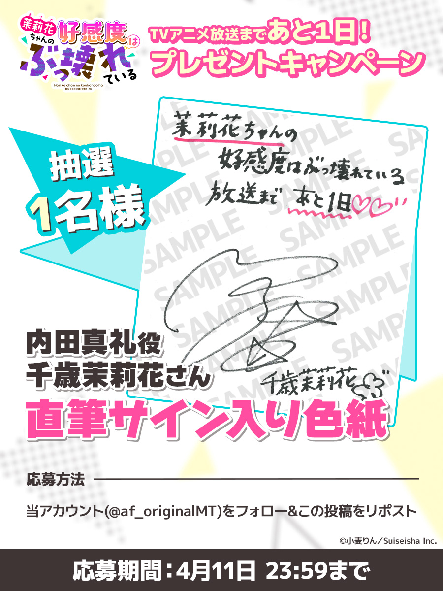 公式Xでは、放送カウントダウンキャンペーンとして<千歳茉莉花役 内田真礼さん直筆サイン入り色紙>を抽選で1名様にプレゼントするキャンペーンを実施しております。